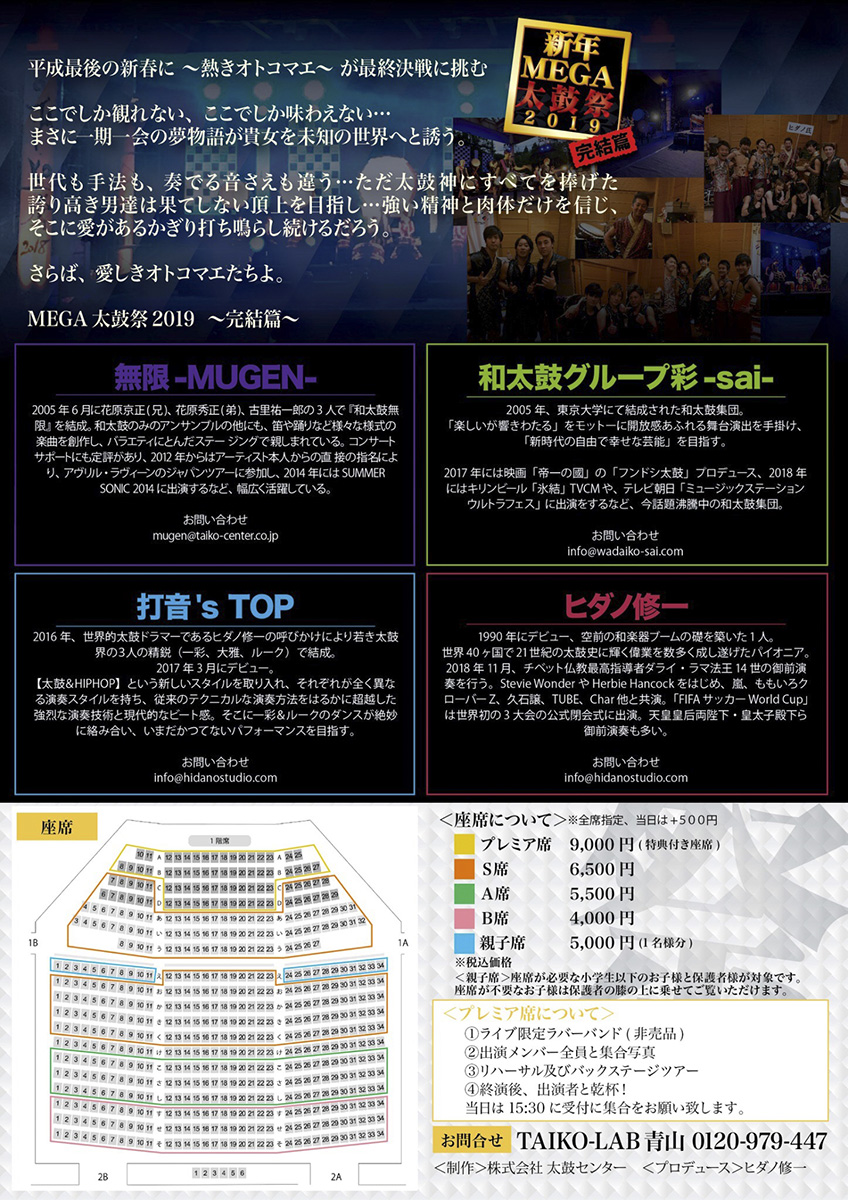 ヒダノ修一(プロデュース)太鼓集団ふじ、和太鼓 批魅鼓、桐蔭学園 和太鼓部[桐蔭太鼓]、焔-Homura-(加藤秀明&椿拓也/太鼓)、太鼓DUO ISA-LU(一彩&ルーク)、スーパー太鼓塾生アンサンブル、